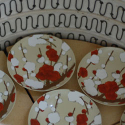 陶主は交趾梅形皿の型の仮起しをしました。私は色絵雪杉図向付の仕上げの色盛りをして窯へ。その後、色絵紅白梅文5寸皿の金付けをしました。