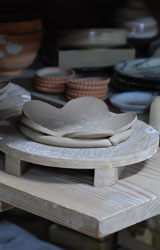 仕事は交趾梅形皿の型起しです。先に起してあった分を削り終えたので数量揃える分作り足します。たたら板を作って、型起しです。絵付けは黄交趾土器皿の色盛りの続きと青交趾豆皿の色盛りです。