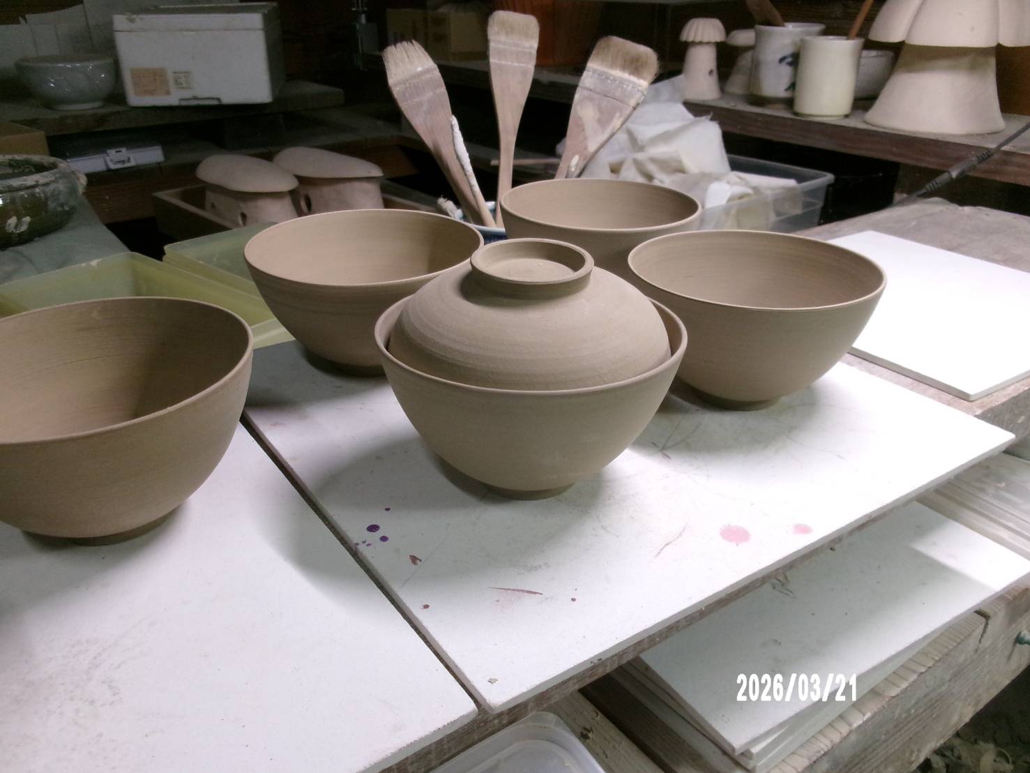 並んだ飯碗を一つひとつ削り、轆轤の線を整えていく。