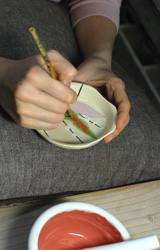 仕事は百合形向付の削り仕上げです。赤絵結び文箸置きの絵付けを終え、窯入れです。