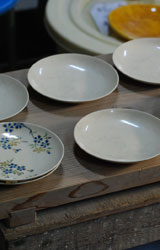 仕事は交趾梅形皿の削りをしながら土の具合が多少変化をしているようで陶主は土の質(土によっては土の層が変わると強度などが変わったりします)が変わっていると判断、もう一度、土を練り直し型起しをすることになりました。絵付けのほうは色絵紅白梅文5寸皿の金付けを終え、窯へ。黄交趾土器皿の色盛りに入りました。