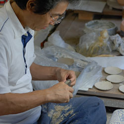 仕事は菊形豆皿の追加型起こしと結び紋箸置きの制作です。箸置きは小物で乾燥が早いので起こしながら乾き具合を見て、結び目の細工を入れていきます。