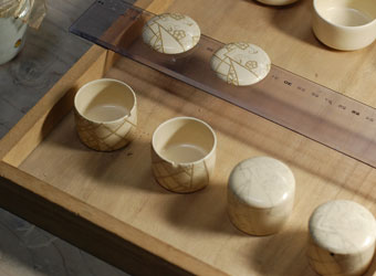 陶主は雪笹文向付の口元を削って仕上げ、白化粧で雪を降らせました。それから菊形豆皿の削り仕上げに入りました。私は結び紋箸置きの型起こしです。