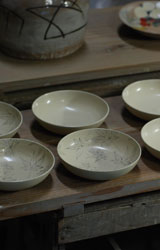 陶主は四方小皿の四方カットを終え、白化粧の用意をしています。明日、竜田川の鉢にかけます。私は十草文飯碗の絵付けです。呉須線から描いていきます。