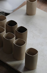 陶主はようじ入れの削り仕上げです。一つづつ、ろくろで削って口元を四方に変形させて仕上げます。青もみじ文鉢ようやく納品数、完成です。十草文飯碗の絵付けの続きです。ゴズ線をひきおえ、鉄絵具で十草をひいていきます。
