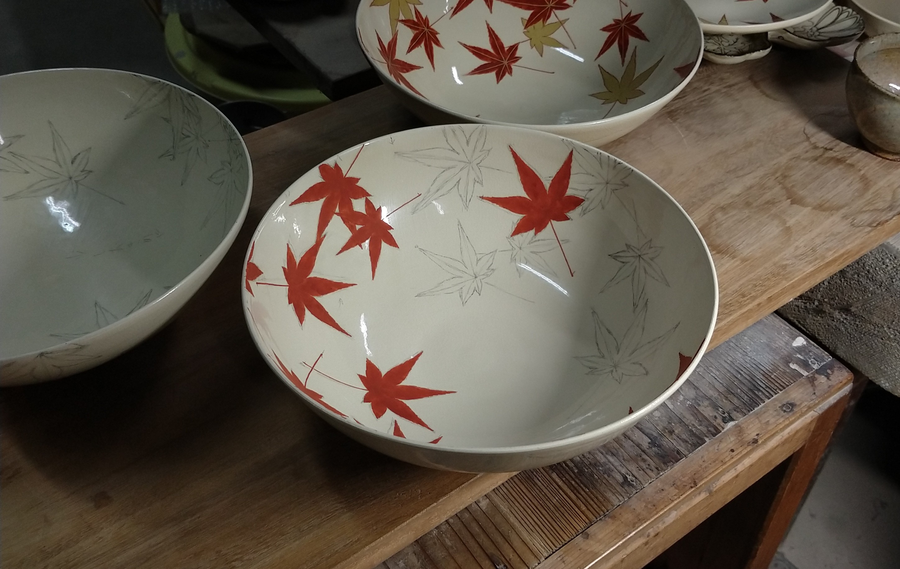 仕事は金彩もみじ紋平向付の赤絵付けと乾山写し竜田川紋小吸物の本体の化粧掛けと蓋の削り仕上げです。