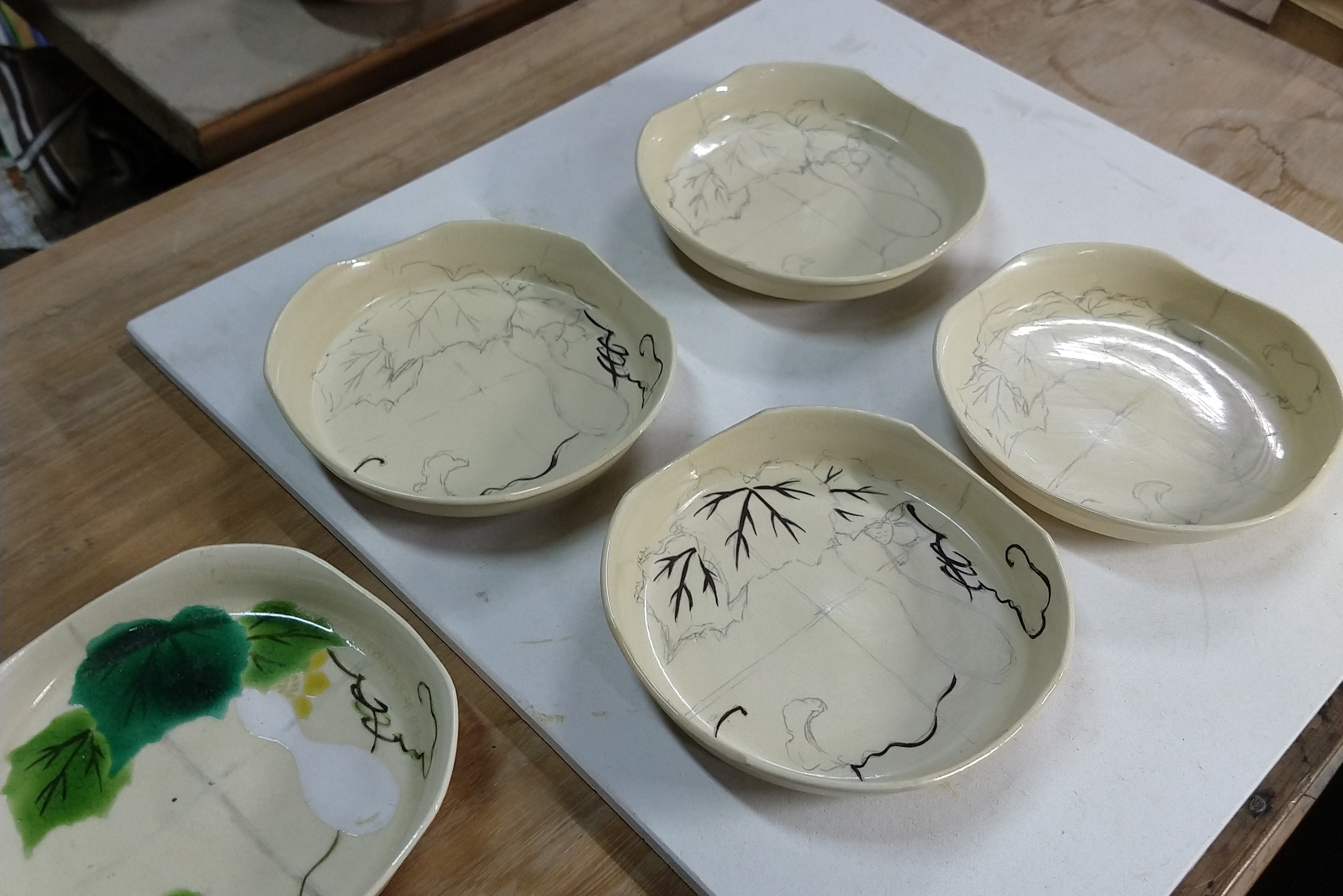 仕事は金彩もみじ紋平向付けの削り仕上げと色絵瓢箪紋四方小皿の割付と葉脈描きです。